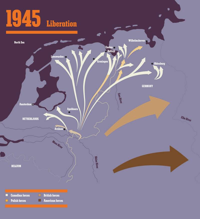 Ondertussen trokken de geallieerden via Frankrijk en België naar Nederland. Dolle Dinsdag, 5 september 1944. Ze passeren de Nederlandse grens in Brabant. De Duitsers slaan op de vlucht en blazen bruggen etc. op, maar capituleren nog lang niet. De Canadezen bevrijdden de Westerschelde haven waarbij er ca. 12.000 jongens sneuvelden en begraven liggen op de Begraafplaats in Bergen op Zoom. Het bevrijden van de haven was noodzakelijk, om zo het enorme legerarsenaal naar Europa te kunnen verschepen. De andere geallieerden rukten op naar Breda, Tilburg en Nijmegen. Het gevecht om de brug bij Nijmegen was een enorme strijd en velen sneuvelden, wederzijds. Deze bevrijdingsoperatie van zuid naar noord, Market Garden genoemd, werd geleid door de Engelse generaal Montgomery. Hij had deze hele operatie erg onderschat en ook de kracht van de Duitsers op de Westerschelde, Nijmegen, Arnhem etc. heeft mede daardoor duizenden jonge mannen het leven gekost voor ons.