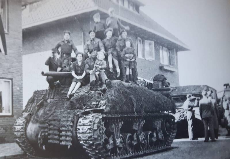 Onze straten en weilanden richting Oldenzaal waren volgepropt met honderden tanks, veldkeukens en veldhospitalen. De burgers mochten overal tussendoor lopen. Als je geluk had, als ons struinend jonge knapen, kreeg je wat uit de heerlijk ruikende veldkeukens. We waren 3 jaar niet naar school geweest, want die zat vol Duitsers. Deze tank stond voor de woning van de aannemer (vader van een van mijn vrienden), die zij zelf gebouwd hadden met een werkplaats erachter. De hele familie + buurvrouw mocht op de tank voor een foto: links de aannemer, midden de lieve moeder van m'n vriend, hij was toen dus ook 9 jaar oud. Prachtig! Eindelijk elke dag feest! Als ik zaterdags bij de familie van m'n vriend was, mocht ik altijd met de andere knapen in hun grote badkamer, want zondags moest je netjes schoon naar de kerk. Dat was bijzonder, want bijna niemand had toen een douche.